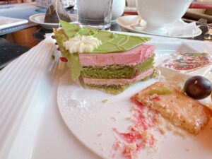 メインのケーキですが、最初にちょっと匂わせてましたが、まずびっくりしたのが、抹茶のクリームが苦い!笑 が、しかし酸っぱいラズベリーと合うし、中の甘めのケーキとの相性抜群。